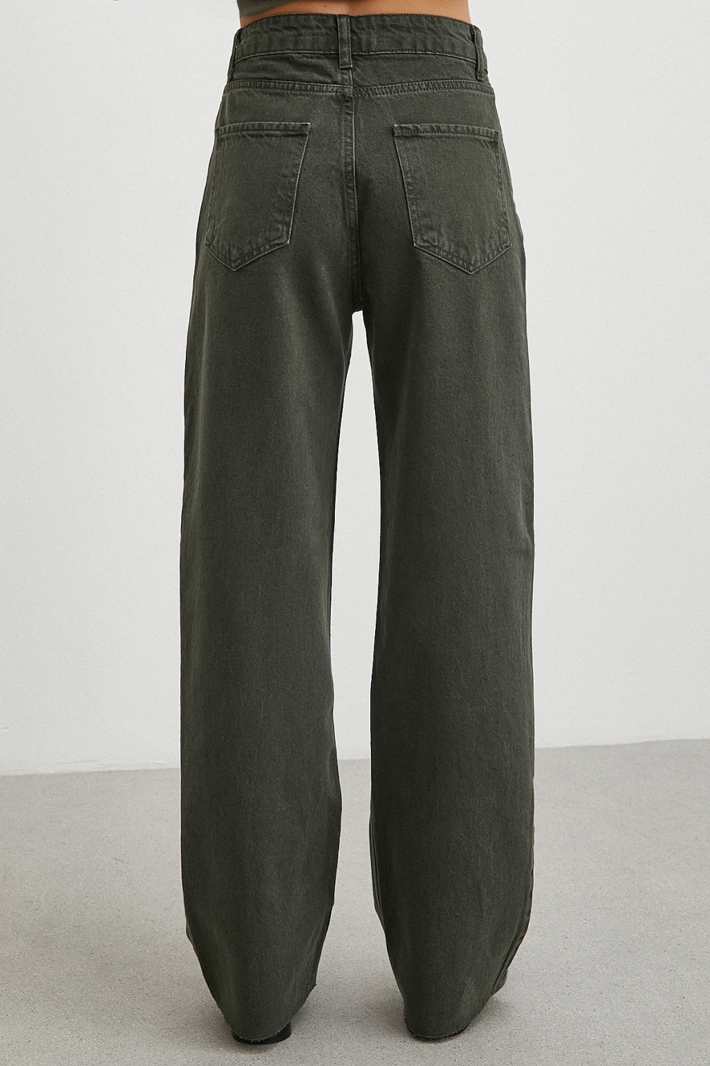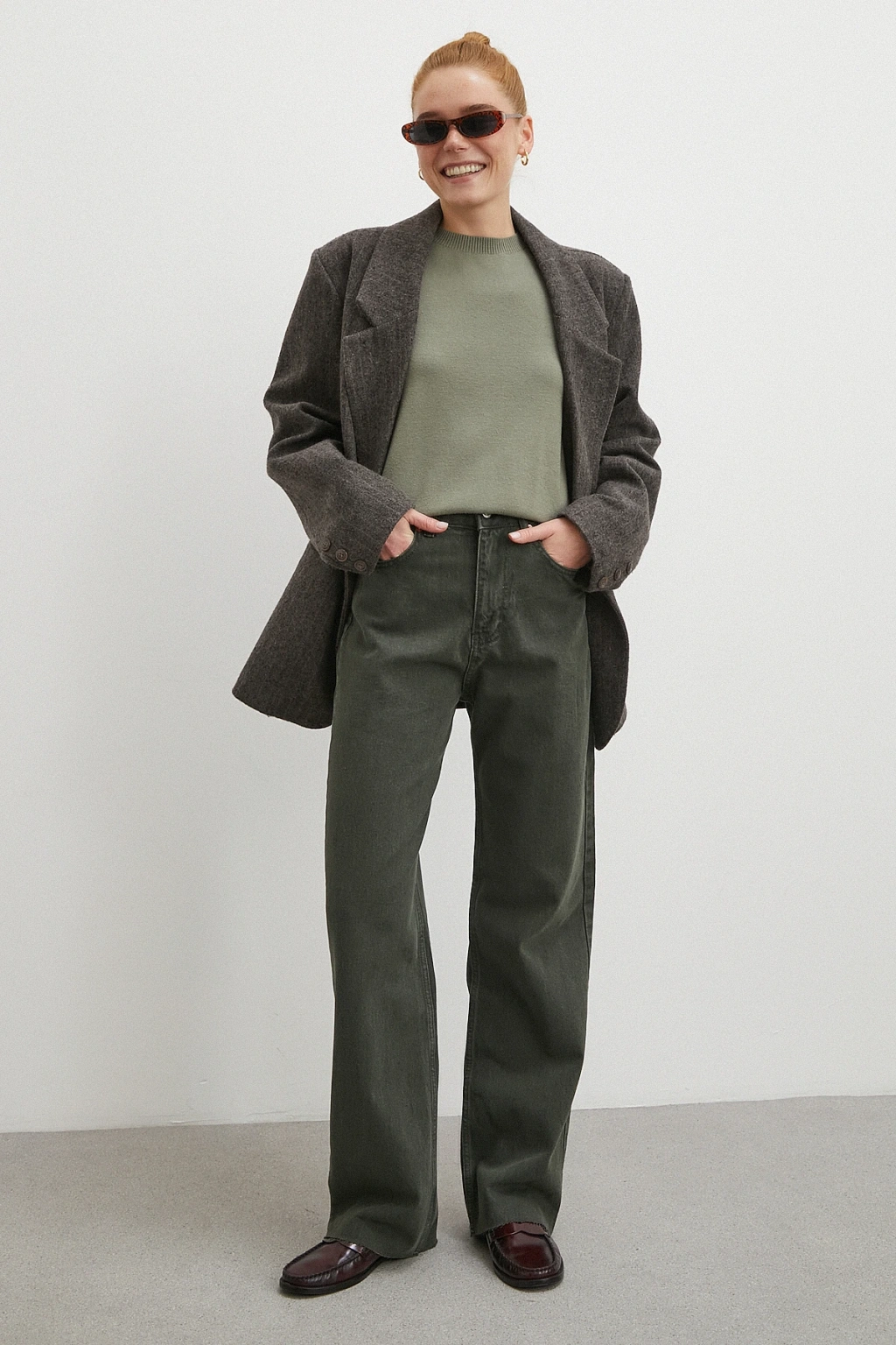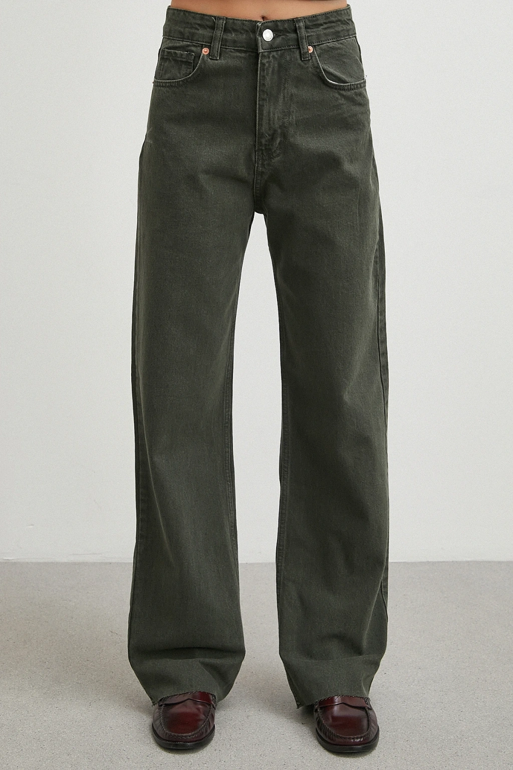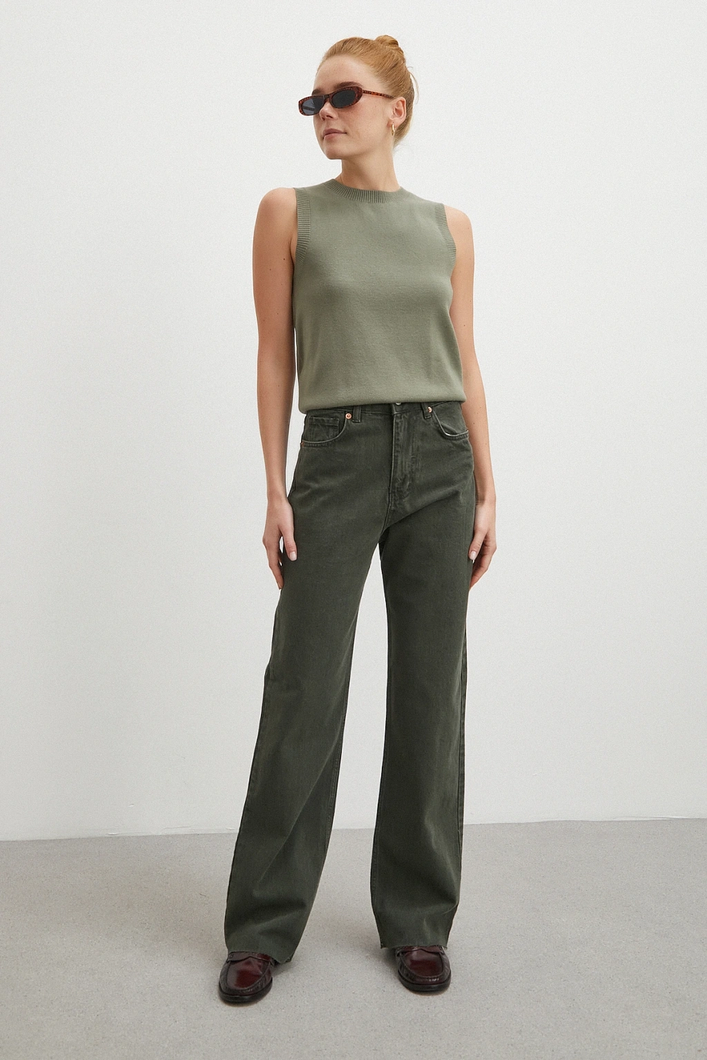 Yüksek Bel Kesik Boru Paça Jean Yeşil