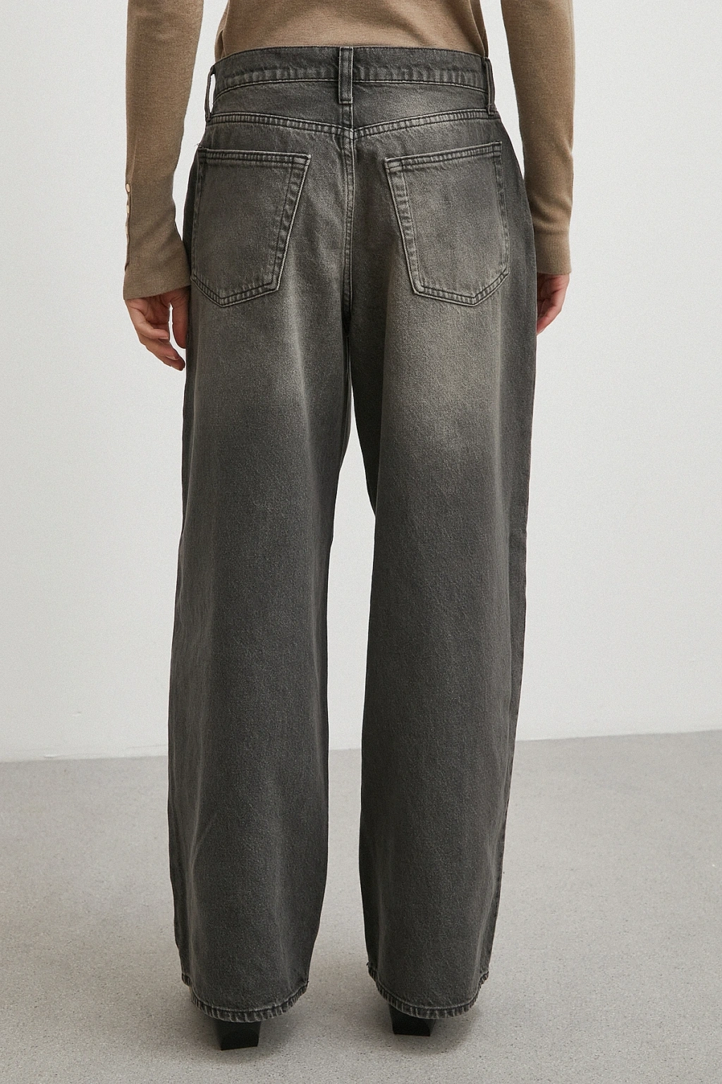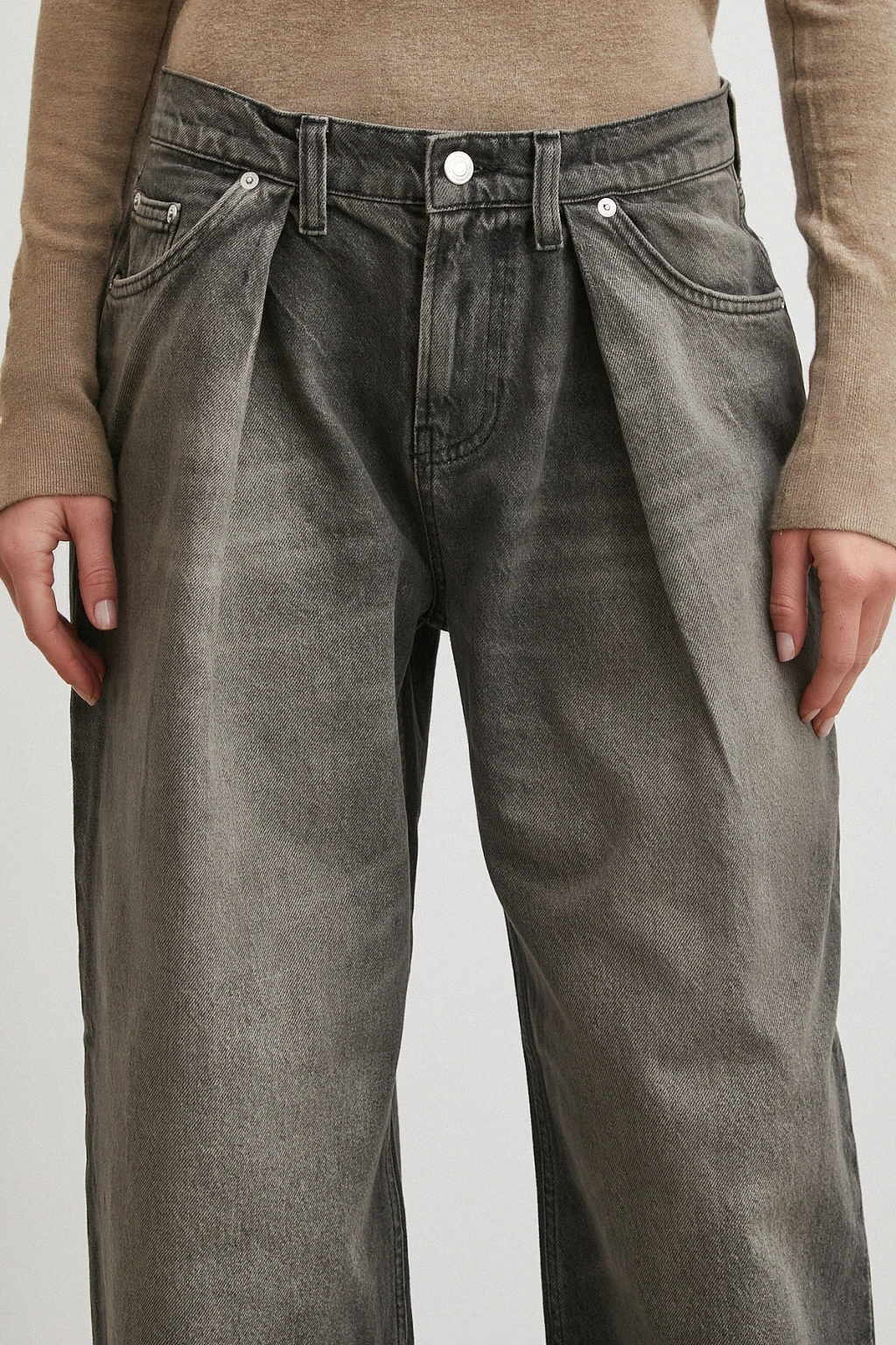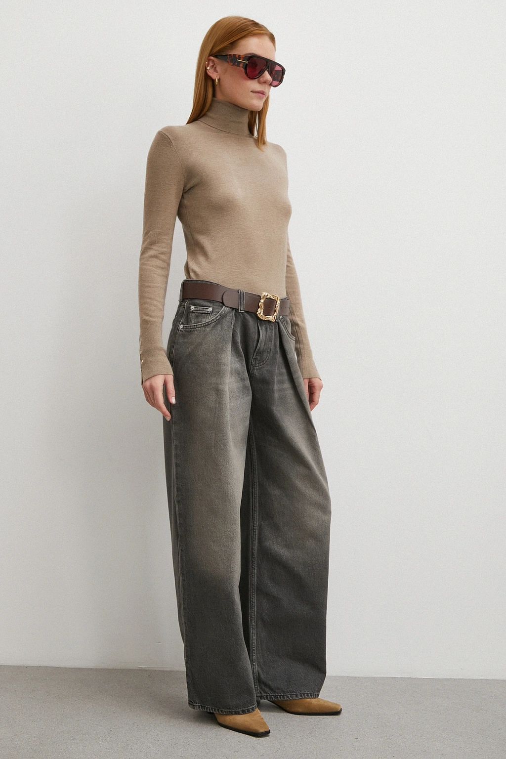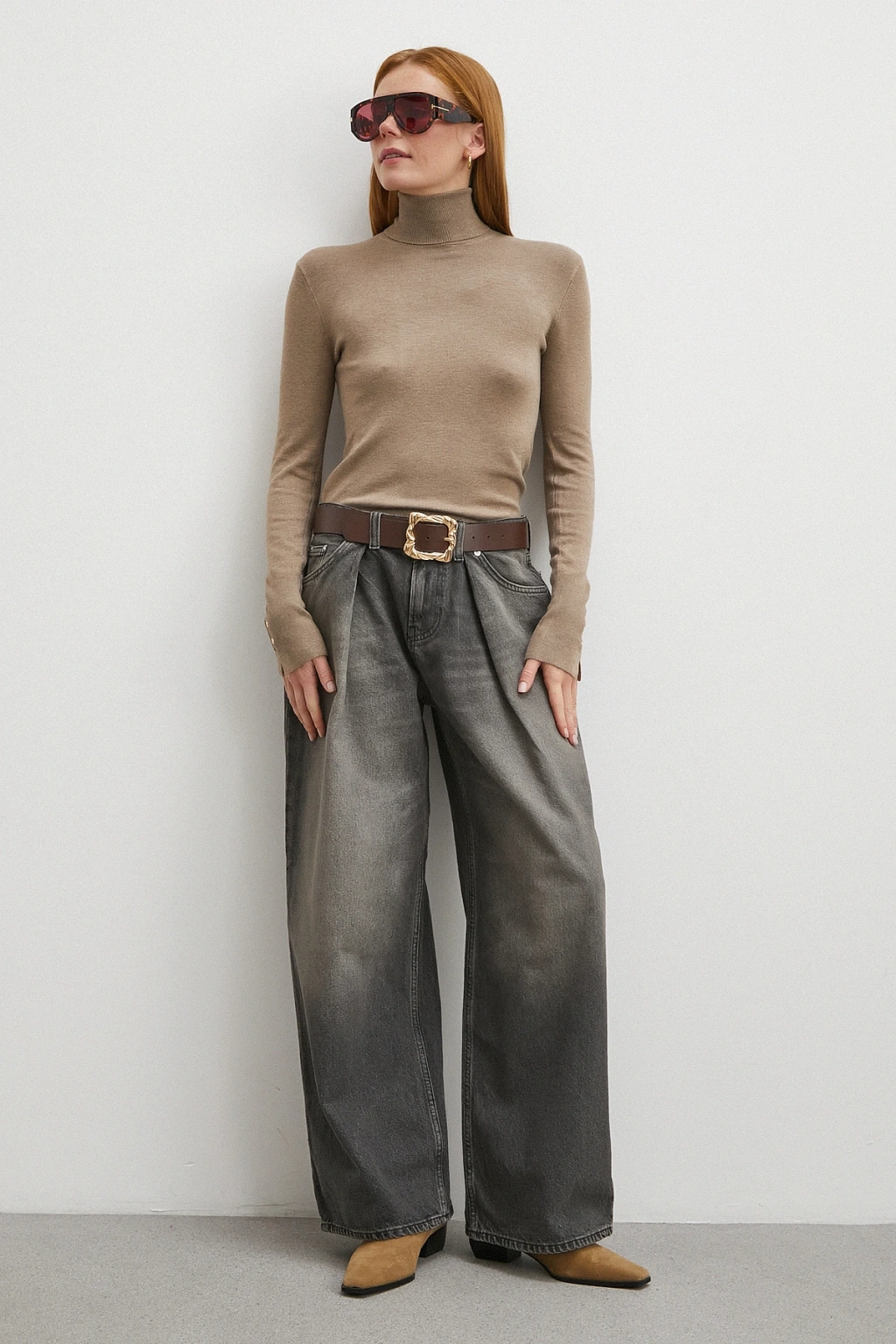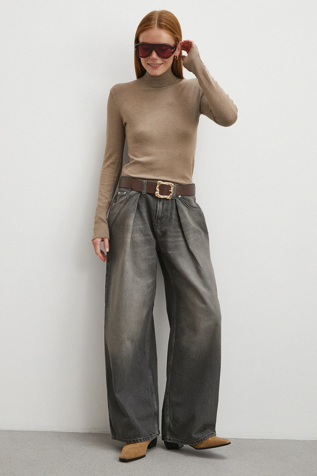 Yüksek Bel Pileli Geniş Paça Jean Füme