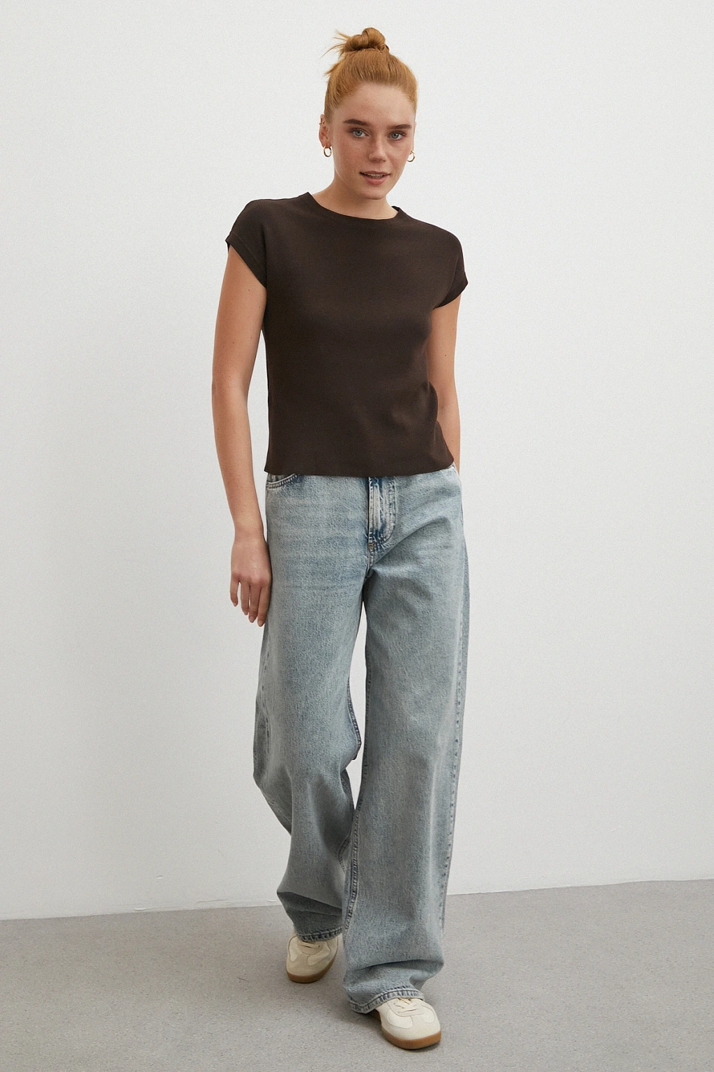 Yüksek Bel Kesik Boru Paça Jean Kahve