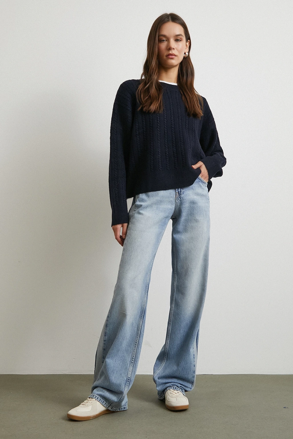 Yüksek Bel Kesik Boru Paça Jean Lacivert
