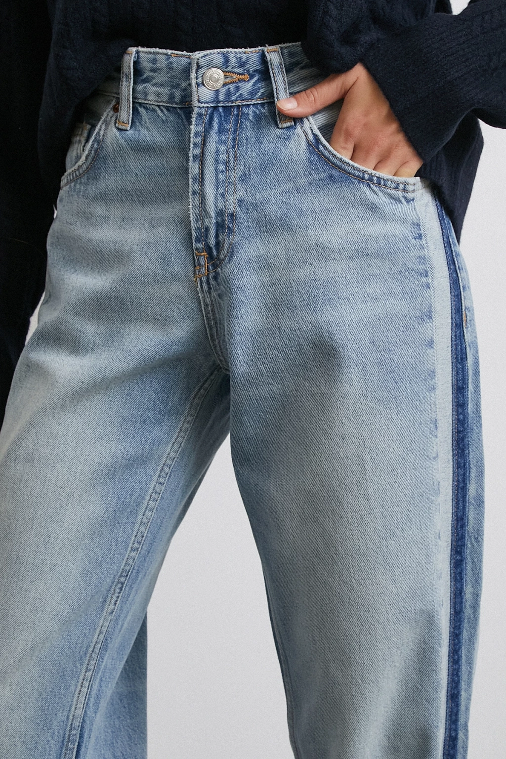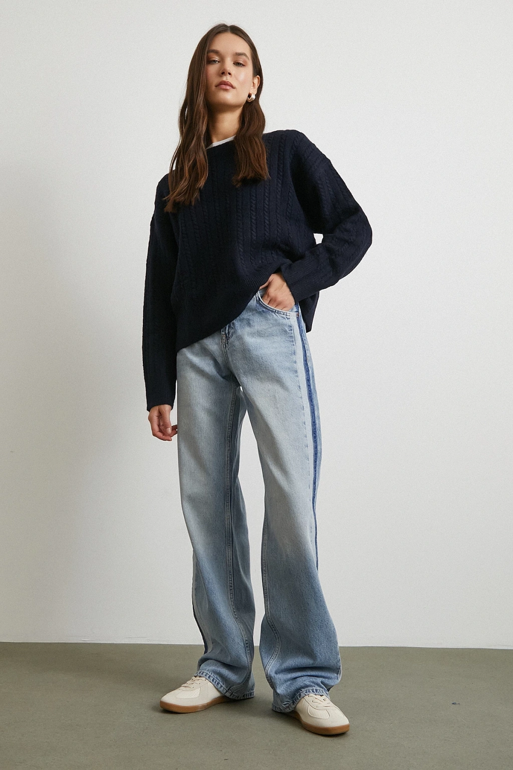 Yüksek Bel Şerit Detaylı Boru Paça Jean Mavi
