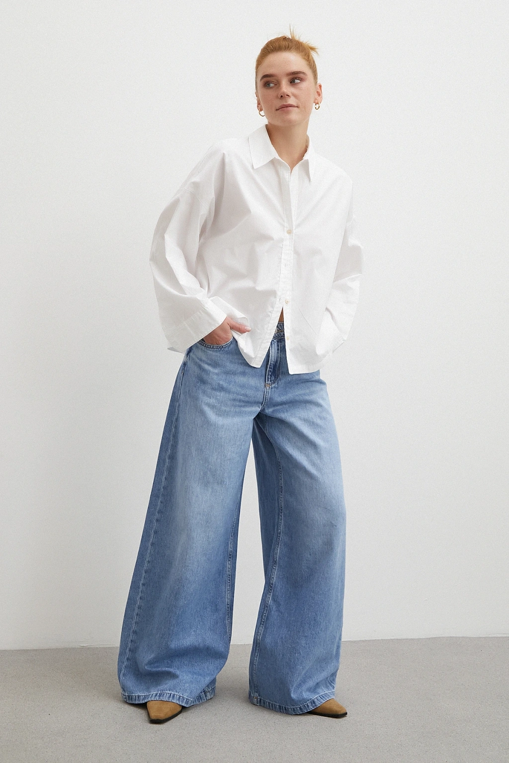 Yüksek Bel Baggy Jean Kırık Beyaz